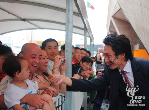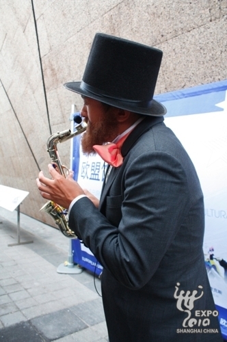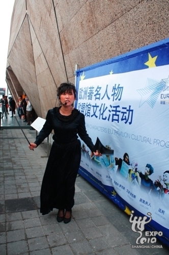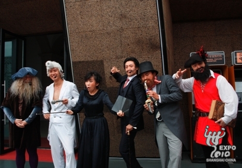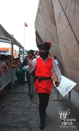 Some actors dressed up as European celebrities to amuse visitors at the entrance of the Portugal Pavilion on 4:45pm yesterday. They played great Europeans such as Marco Polo, Leonardo Da Vinci, Adolphe Sax, Marie Curie and Salvador Dali.