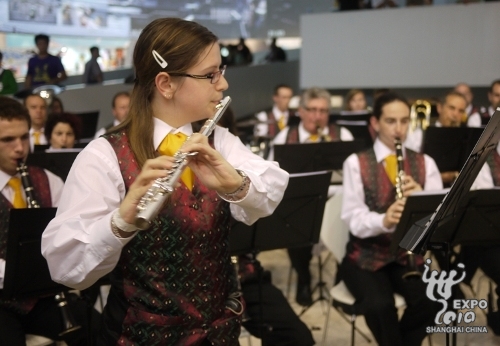 The Meyrin-Geneva Municipal Brass Band entertained visitors at the Geneva-Zurich-Basel Pavilion with a fusion of classic, jazz and modern rhyme yesterday.
