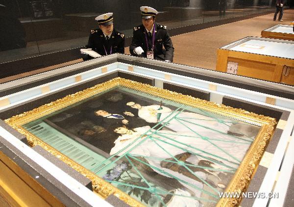 Staff members of Shanghai Customs examine a painting by Edouard Manet in east China's Shanghai on Nov. 1, 2010. The French national treasures exhibited in 2010 Shanghai World Expo were about to be sent back to France. (Xinhua/Xing Guangli)