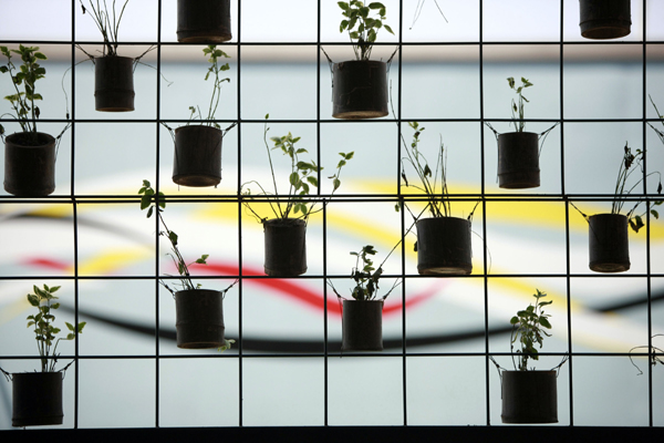 Flower pots made of bamboos are displayed on the exterior walls of the Indonesia Pavilion in the World Expo in Shanghai, east China, on May 3, 2010. Bamboo decoration materials present the idea of utilizing natural resources in a recyclable way in Indonesia. (Xinhua/Zou Guangping)