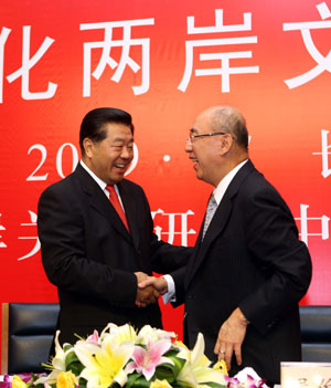 Jia Qinglin (L), chairman of the National Committee of the Chinese People's Political Consultative Conference, shakes hands with Kuomintang (KMT)'s chairman Wu Poh-hsiung at the closing ceremony of the fifth Cross-Straits Economic, Trade and Culture Forum in Changsha, capital of central China's Hunan Province, July 12, 2009. (Xinhua/Xing Guangli)