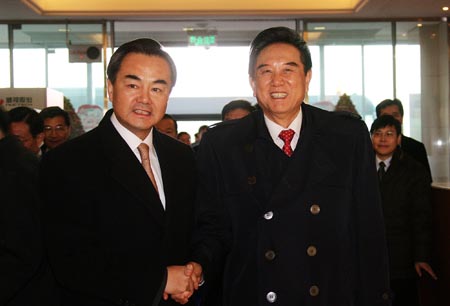 Wang Yi (L), director of the Taiwan Work Office of the Central Committee of the Communist Party of China, welcomes Chen Yunlin, president of the Chinese mainland's Association for Relations Across the Taiwan Straits (ARATS), upon Chen's arrival at Capital International Airport in Beijing, capital of China, Dec. 25, 2009. Chen Yunlin and his ARATS delegation returned to Beijing on Friday after ending a trip in southeast China's Taiwan for the fourth round of talks between ARATS and the Taiwan-based Straits Exchange Foundation. (Xinhua/Xing Guangli)