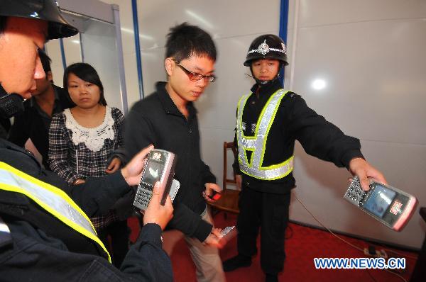 Passengers go through a security check at a highway entrance to Guangzhou, capital of south China's Guangdong Province, Nov. 10, 2010. Guangzhou will witness the openning ceremony of the 16th Asian Games on Friday night. (Xinhua/Nan Fei)