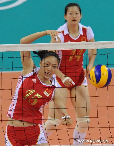 China's Ma Wenwen (Front) competes during the women's volleyball Group A preliminary against Mongolia at the 16th Asian Games held in Guangzhou, capital of south China's Guangdong Province, Nov. 14, 2010. China won by 3-0. (Xinhua/Li Qiuchan)