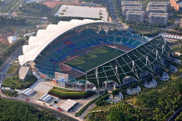 The photo taken on Oct. 29, 2010 shows the ariel view of the stadium of University Town in Guangzhou, south China's Guangdong Province. It will host the football and rugby match of the 16th Asian Games. (Xinhua/Liu Dawei)