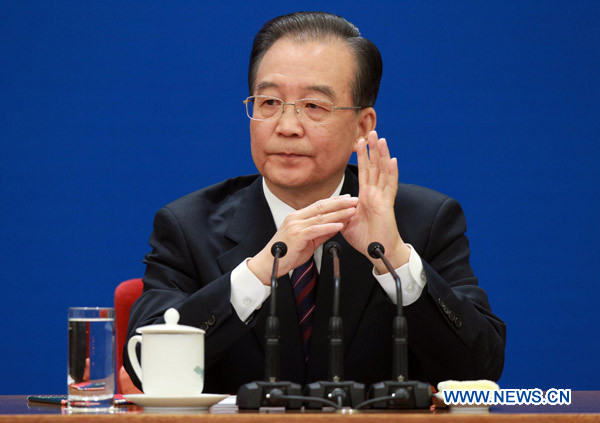 Chinese Premier Wen Jiabao gestures as he speaks during a press conference after the closing meeting of the Fourth Session of the 11th National People's Congress (NPC) at the Great Hall of the People in Beijing, China, March 14, 2011.(Xinhua/Pang Xinglei)