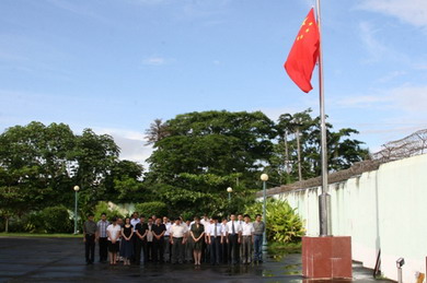 當(dāng)?shù)貢r間8月15日早8時,中國駐圭亞那使館全體館員和援圭醫(yī)療隊專家在使館舉行降半旗儀式,深切悼念在甘肅省舟曲縣特大山洪泥石流災(zāi)害中遇難的同胞。全體人員默哀三分鐘,遙寄哀思。
