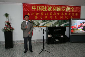 2010年5月27日,雨霽初晴的拉巴斯高原秋意盎然,中國(guó)駐玻利維亞大使屈生武舉辦的玉樹地震拉巴斯僑界捐款答謝暨玻母親節(jié)慰問晚會(huì)在簡(jiǎn)約而隆重的氣氛下進(jìn)行,旅玻拉巴斯主要僑領(lǐng)、捐款僑胞代表、拉巴斯僑界婦女代表共60余人出席。