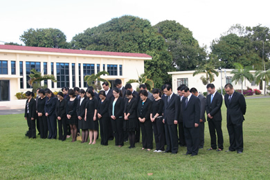 隨后,哀悼儀式正式開始。國旗冉冉升起,升至頂端后緩緩降至三分之一處。在邊大使的帶領(lǐng)下,全體館員神情凝重,靜默肅立,面向國旗默哀3分鐘,表達(dá)對(duì)舟曲特大山洪泥石流災(zāi)害中遇難同胞的深切哀悼。 |