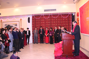6點(diǎn)30分,招待會(huì)在歡快的樂(lè)曲聲中開(kāi)始。張大使首先向參加招待會(huì)的所有來(lái)賓拜年,并委托他們向各自家人和其他華人朋友轉(zhuǎn)達(dá)新春祝福。他說(shuō),2010年,全國(guó)各族人民在黨中央、國(guó)務(wù)院的領(lǐng)導(dǎo)下,不斷取得驕人業(yè)績(jī),綜合國(guó)力又有了明顯提升,已成為世界第二大經(jīng)濟(jì)體;通過(guò)抗擊自然災(zāi)害,成功舉辦上海世博會(huì)和廣州亞運(yùn)會(huì),并沉著應(yīng)對(duì)復(fù)雜的國(guó)際形勢(shì),中國(guó)向世界展示了一個(gè)堅(jiān)定自信、開(kāi)放包容、進(jìn)步友好的大國(guó)形象。2010年也是中比關(guān)系的豐收年,兩國(guó)在政治、經(jīng)貿(mào)、文化、教育、科技以及其他領(lǐng)域的交流和合作取得新的進(jìn)展。張大使指出,廣大旅比僑胞在積極融入當(dāng)?shù)厣鐣?huì)的同時(shí)不忘故土,當(dāng)國(guó)內(nèi)發(fā)生自然災(zāi)害時(shí),紛紛伸出援手,對(duì)貧困地區(qū)的人民慷慨解囊,令人感動(dòng),他再次代表使館表示感謝。張大使還介紹了不久前胡錦濤主席對(duì)美國(guó)進(jìn)行的國(guó)事訪問(wèn),指出在這次影響深遠(yuǎn)、成果豐碩的國(guó)事訪問(wèn)中,雙方全面規(guī)劃了今后一個(gè)時(shí)期發(fā)展關(guān)系的重點(diǎn)方向和深化合作的重點(diǎn)領(lǐng)域,確認(rèn)雙方共同努力,建設(shè)相互尊重、互利共贏的合作伙伴關(guān)系。張大使表示,2011年是中國(guó)十二五規(guī)劃的開(kāi)局之年,同時(shí)也將迎來(lái)中比建交40周年,他呼吁大家以更加扎實(shí)的努力,實(shí)現(xiàn)中比友好合作關(guān)系躍上新臺(tái)階。