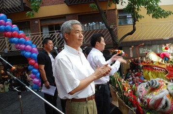 中國駐阿根廷大使殷恒民和阿根廷華人超市公會主席陳大明共同為長龍和醒獅點睛