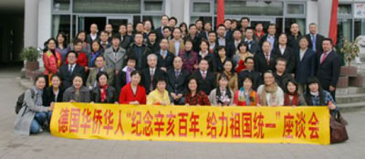 2011年3月31日,由旅德華僑華人中國和平統(tǒng)一促進(jìn)會(huì)牽頭,旅德僑界在柏林舉行“紀(jì)念辛亥百年、給力祖國統(tǒng)一”座談會(huì)。駐德國大使吳紅波、領(lǐng)事部主任黎一建參贊以及全德華僑華人聯(lián)合總會(huì)、全德華人社團(tuán)聯(lián)合會(huì)、巴伐利亞州華商聯(lián)合會(huì)、漢堡華僑華人聯(lián)合總會(huì)等30多個(gè)僑團(tuán)代表、華僑華人、臺(tái)灣同胞近80人出席。新華社、中央電視臺(tái)、人民日報(bào)、中國國際廣播電臺(tái)以及《歐洲新報(bào)》等多家媒體到場報(bào)道。