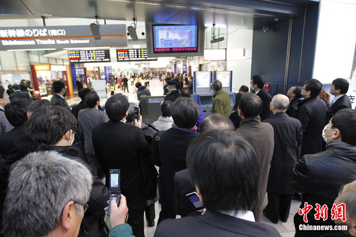 日本近海3月11日發(fā)生了強(qiáng)烈地震,首都東京震感強(qiáng)烈。日本氣象廳隨即發(fā)布了海嘯警報(bào),稱地震將引發(fā)約6米高海嘯。圖為日本東京品川站受強(qiáng)震影響停運(yùn),旅客在車站內(nèi)實(shí)時(shí)關(guān)注最新地震情況。