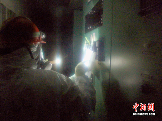 日本原子能安全保安院發(fā)布的照片顯示:2011年3月23日,東京電力公司工作人員在福島第一核電站1號、2號機組的中央控制室內部檢查儀器參數(shù)、收集資料。