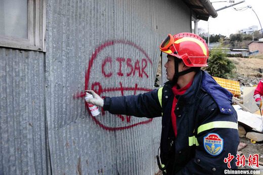 3月15日下午,中國國際救援隊隊員在巖手縣大船渡市受大海嘯襲擊后的災(zāi)區(qū)實施搜救。在確認一幢房屋中已經(jīng)沒有生命跡象之后,一名隊員在墻壁上噴涂標識。大船渡市緊鄰海港,是此次日本東北大地震中受災(zāi)最嚴重的地區(qū)之一。中新社發(fā) 侯宇 攝