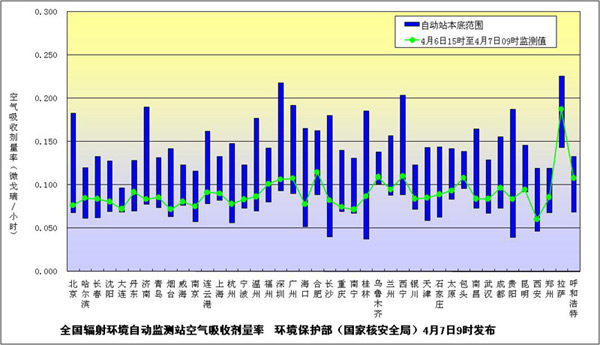 在4月6日的空氣監(jiān)測(cè)樣本中,我國(guó)內(nèi)地除貴州外,其他省、自治區(qū)、直轄市部分地區(qū)均檢出來(lái)自日本核事故釋放出的極微量人工放射性核素碘-131。其中,北京、上海、天津、重慶、河北、山西、遼寧、吉林、黑龍江、江蘇、浙江、安徽、福建、江西、山東、河南、湖北、湖南、廣東、陜西、寧夏和新疆等省、自治區(qū)和直轄市空氣中同時(shí)監(jiān)測(cè)到更加微量的人工放射性核素銫-137和銫-134。從江蘇地區(qū)的萵苣葉、廣東地區(qū)的莙荙菜抽檢中發(fā)現(xiàn)了極微量的放射性碘-131。對(duì)飲用水的抽樣監(jiān)測(cè)無(wú)異常。各地環(huán)境輻射水平較昨天沒(méi)有明顯變化。