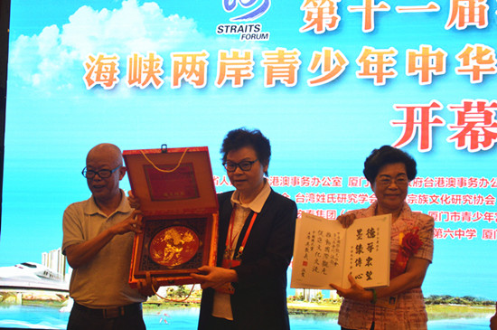 6月14日晚,第十一屆海峽論壇·海峽兩岸青少年中華姓氏源流知識競賽開幕式在廈門華僑大廈(大酒店)舉行。來自海峽兩岸的參賽選手、觀摩師生以及兩岸民間社團嘉賓參加了開幕式暨歡迎晚宴,相關單位領導蒞臨現(xiàn)場。廈門市姓氏源流研究會會長陳淑娥、臺灣姓氏研究學會榮譽理事長林培圣、金門宗族文化研究協(xié)會理事長葉鈞培、臺灣中華國際觀光協(xié)會理事長詹秀蓉分別致辭,廈門市政協(xié)副主席陳昌生對大賽的成功舉辦給予美好祝愿。開幕式上,《廈門與臺灣姓氏文化》一書首發(fā)儀式舉行,海峽兩岸民間社團互贈紀念品。