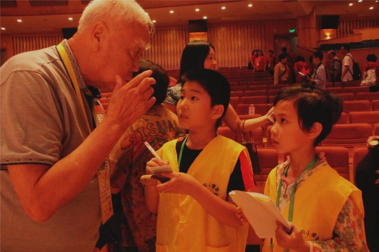 在最后高潮的頒獎(jiǎng)儀式落下帷幕后,敏捷的小記者們帶著心中的問(wèn)題向著臺(tái)上臺(tái)下的選手以及嘉賓們采訪!罢(qǐng)問(wèn)您平時(shí)怎么學(xué)習(xí)和儲(chǔ)備這么多的姓氏文化知識(shí)呀”、“第一次來(lái)廈門覺(jué)得和臺(tái)灣兩座城市有哪些的?”、“哥哥姐姐你們?cè)趺纯朔闹械木o張”、“評(píng)委老師您對(duì)今天的選手們?cè)u(píng)分標(biāo)準(zhǔn)是如何的?”、“您作為從臺(tái)灣來(lái)的觀眾,今天的姓氏大賽給了您哪些感想,今后會(huì)常來(lái)我們廈門嗎”、等等。臺(tái)灣代表隊(duì)的選手、廈門代表隊(duì)的選手、帶隊(duì)老師、評(píng)委老師、主辦方等,小記者們分組有禮貌地一一解開(kāi)疑惑,記下需要的素材,部分小記者采訪到心儀的選手并留下合影。