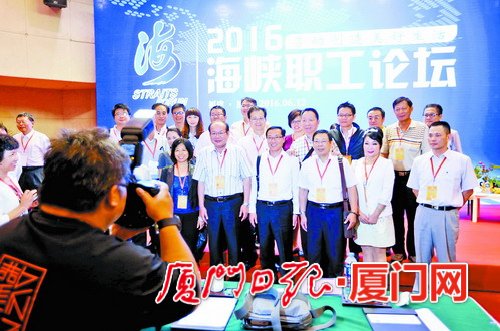作為第八屆海峽論壇基層交流活動的重要組成部分,昨日,2016海峽職工論壇在廈舉行,200多名兩岸工會干部、勞模和職工代表圍繞“勞動創(chuàng)造美好生 活”這一主題,進行深入交流。中華全國總工會黨組書記、副主席、書記處第一書記李玉賦,省人大常委會副主任、省總工會主席張廣敏,省總工會黨組書記、副主 席陳震,廈門市政協(xié)副主席、市總工會主席詹滄洲,以及臺灣海峽兩岸勞工發(fā)展交流協(xié)會理事長侯彩鳳、臺灣中華兩岸勞動關系發(fā)展協(xié)會理事長姚江臨等出席論壇。