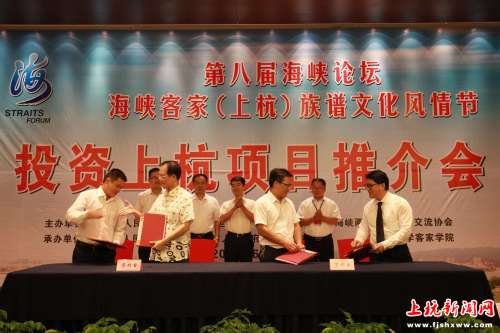 6月13日,第八屆海峽論壇·海峽客家(上杭)族譜文化風情節(jié)投資上杭項目推介活動舉行,現場簽約大地生機(福建)農業(yè)發(fā)展有限公司增資擴股、閩臺文化藝術創(chuàng)作展示與旅游基地、跨境電商農特產品保稅倉及高雄觀光協會旅游合作等4個項目。縣委常委、常務副縣長胡濱,副縣長袁靜出席活動。