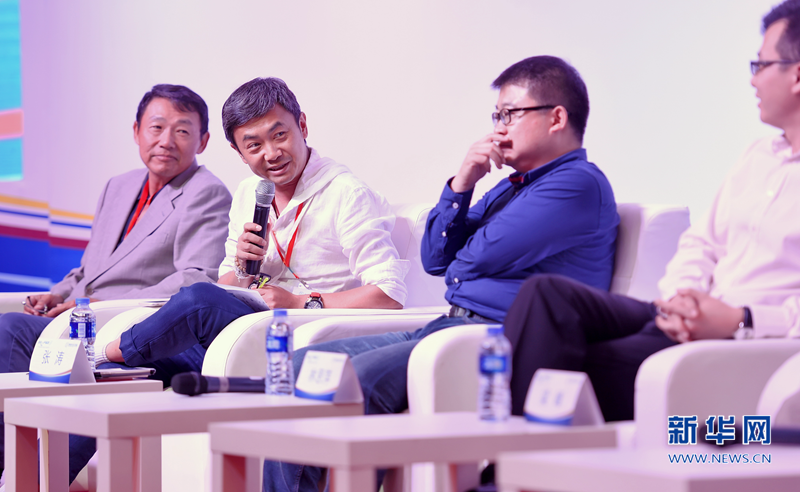 6月12日,“優(yōu)客工場”創(chuàng)始人毛大慶(左二)在高峰對話環(huán)節(jié)中發(fā)言。新華社記者林善傳攝