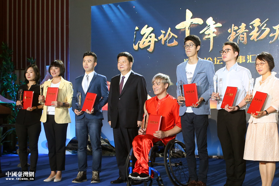 中共中央臺(tái)辦、國(guó)務(wù)院臺(tái)辦副主任龍明彪(左四)為“海論十年、精彩無(wú)限”海峽論壇十年故事匯講述者頒獎(jiǎng)。(中國(guó)臺(tái)灣網(wǎng) 尹賽楠 攝)