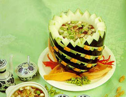 1.將光鴨洗凈;冬瓜去皮切塊;蔥洗凈。 2.炒鍋內(nèi)放油燒五成熱,將光鴨放進炒鍋內(nèi)炸透撈出瀝油。 3.將鴨、冬瓜、陳皮、姜塊、蔥條、米仁放入場鍋中,加清水5杯,用大火燒開鍋后,烹入米酒、精鹽3荼匙,改用小火提至酥 爛,放入精鹽2茶匙調(diào)味即成。 特點:此菜湯味鮮美,營養(yǎng)豐富。