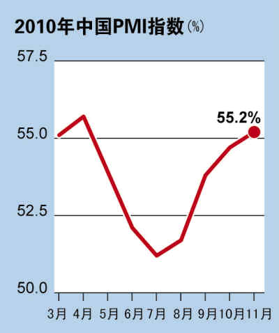 12月1日,中國(guó)物流與采購(gòu)聯(lián)合會(huì)(CFLP)公布中國(guó)11月份制造業(yè)采購(gòu)經(jīng)理人指數(shù)(PMI)為55.2%,較前一個(gè)月上升0.5個(gè)百分點(diǎn),這也是該指數(shù)連續(xù)第四個(gè)月走高。然而,隨著其中購(gòu)進(jìn)價(jià)格指數(shù)的大幅上揚(yáng),未來(lái)通貨膨脹的預(yù)期更是進(jìn)一步彰顯無(wú)疑。