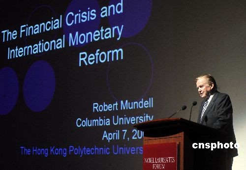 四月七日,香港理工大學舉行“諾貝爾得獎者論壇”。諾貝爾經濟學獎得主羅伯特·蒙代爾教授應邀出席論壇,圖為在論壇上羅伯特·蒙代爾教授以“金融危機及國際貨幣改革”為講題演講。 中新社發(fā) 鄧慶樂 攝