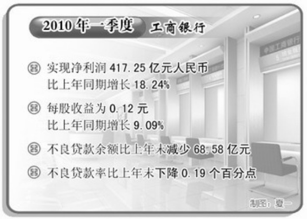 工商銀行2010年第一季度實現(xiàn)凈利潤417.25億元人民幣,比上年同期增長18.24%,每股收益為0.12元,比上年同期增長9.09%。