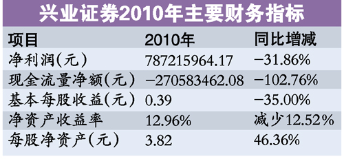 根據(jù)今日披露的年報,興業(yè)證券2010年的營業(yè)總收入為27.38億元,同比下降11.26%。同時,凈利潤僅有7.87億元,同比大幅減少了31.86%。每股收益、加權每股凈資產(chǎn)收益率等主要財務指標均出現(xiàn)三成以上的降幅,其中每股現(xiàn)金流量凈額下降了102.77%。