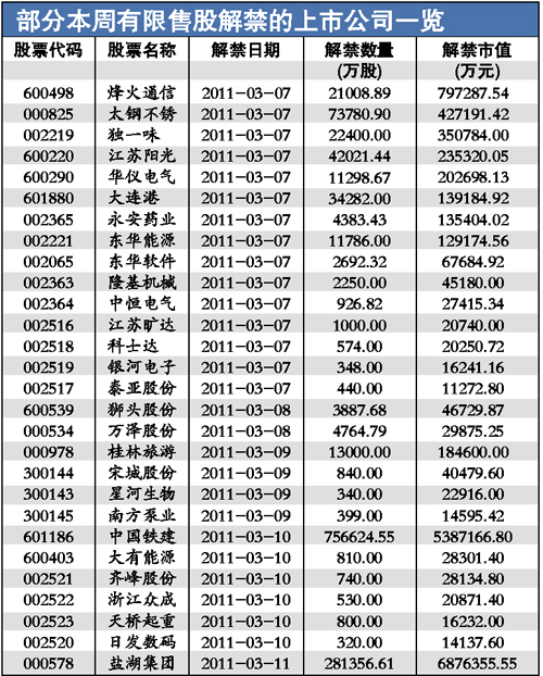 從個股的解禁市值來看,鹽湖集團位居首位。數(shù)據(jù)顯示,該公司的28.14億股的限售股將于3月11日解禁。如果按照該公司停牌前的24.44元的價格計算,解禁市值達到688億元。中國鐵建緊隨其后,該公司75.66億股有限售條件的股票3月10日出籠,解禁市值達到539億元,兩者合計解禁市值達到1227億元,占下周總解禁市值的80%。