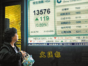 據(jù)香港《文匯報》報道,3月31日是港股今年首季最后一個交易日,大市收升119點報13576點,但首季計跌達5.6%,或811.46點,跌幅在亞太區(qū)排第3。大市市值蒸發(fā)約2740億元,余下約10萬億元。分析員指出,大市3月份走勢有好轉跡象,但在1.4萬點見阻力,料第二季仍為波動市,將在1.3萬-1.4萬點上下。
