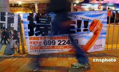 香港特區(qū)行政長官曾蔭權(quán)四月初表示,香港經(jīng)濟(jì)正面對自二次大戰(zhàn)以來最嚴(yán)峻的挑戰(zhàn)。圖為香港街頭有團(tuán)體推出電話熱線,幫助市民緩解金融海嘯帶來的壓力。 中新社發(fā) 武仲林 攝