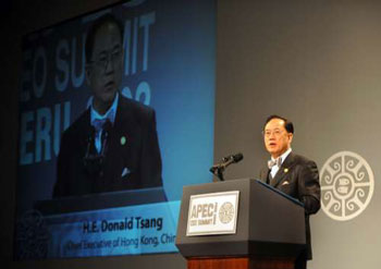 將于下月出席亞太經(jīng)合會議的曾蔭權(quán)表示,會就規(guī)管評級公司、對沖基金等提出意見。圖為曾蔭權(quán)去年在同一會議上發(fā)表演說。(圖片來源:大公報)