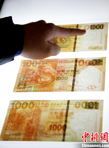 中新網(wǎng)11月25日電 據(jù)香港星島日?qǐng)?bào)報(bào)道,香港金管局聯(lián)同三家發(fā)鈔銀行,將于下月七日推出新設(shè)計(jì)的一千元鈔票供巿民兌換。首批七千多萬(wàn)張新鈔票,會(huì)由三家發(fā)鈔銀行分批發(fā)行,舊款鈔票仍然流通。新一千元鈔票共有八項(xiàng)防偽特征,香港印鈔有限公司特別購(gòu)入新機(jī)械及貴價(jià)油墨印制新鈔,造出移動(dòng)鈔票時(shí)有一條光紋于圖案上下滾動(dòng)的效果;新鈔紙質(zhì)較厚,會(huì)更耐用,“壽命”可延長(zhǎng)三成。