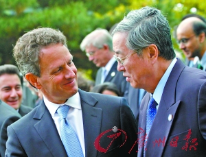 美國財長蓋特納(左)和中國央行行長周小川出席G20財長會議。