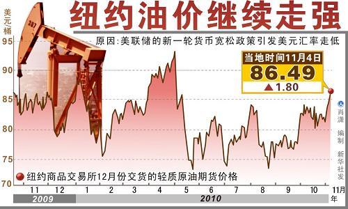 國際油價(jià)上周出現(xiàn)“五連陽”,紐約商業(yè)期貨交易所(NYMEX)12月原油期貨上周五收?qǐng)?bào)86.85美元/桶,超過今年的最高收位86.84美元,且錄得2008年10月8日以來的最高結(jié)算價(jià)。盤中最高達(dá)到87.22美元/桶,為2008年10月9日以來的最高水平。
