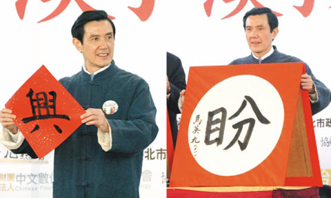 馬英九昨天新年開筆,寫下聯合報選出的年度代表字“盼”,另寫下祈愿字“興”,盼今年臺灣興旺。