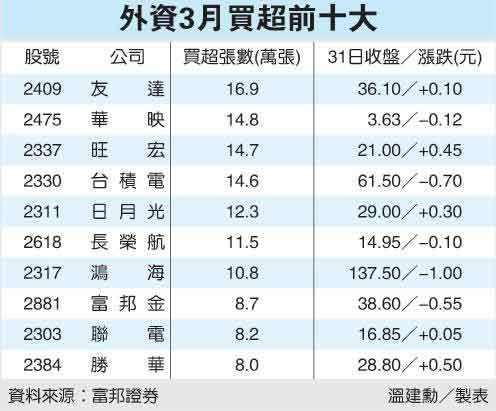 外資3月前十名的買超標(biāo)的集中面板、半導(dǎo)體,其中以友達(dá)買超16.9萬張居冠。摩根士丹利科技產(chǎn)業(yè)分析師王安亞,高喊友達(dá)董監(jiān)改選行情啟動。友達(dá)融券余額已從1月下旬高峰的2.3萬多張,降到昨天的6800多張。王安亞認(rèn)為,友達(dá)在2001年、2004年、2007年分別改選董監(jiān),當(dāng)年股價(jià)都有20%至50%的漲幅,今年友達(dá)的改選行情同樣值得期待;此番論點(diǎn)吸引外資買盤先行卡位。