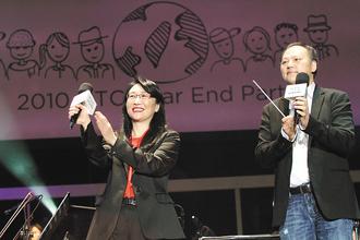 宏達(dá)電董事長王雪紅(左)與執(zhí)行長周永明創(chuàng)造出品牌價值。圖為兩人之前在公司尾牙上合唱。圖片來源:臺灣《經(jīng)濟(jì)日報》