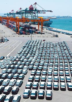 趕在奢侈稅6月1日開征前,巴拿馬籍烏托邦公爵號汽車船,29日載著總數(shù)共一千輛的BMW、BENZ汽車抵達臺中港,碼頭上停滿百萬以上亮閃閃的進口車海。 圖片來源:臺灣《中國時報》