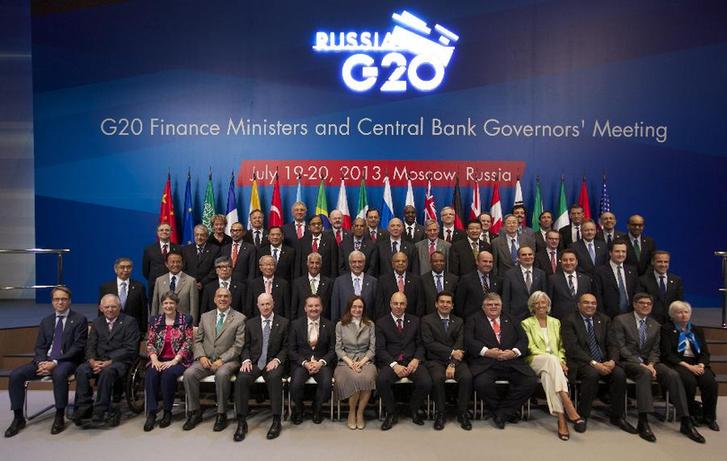 新華社照片,莫斯科,2013年7月20日 G20財(cái)長和央行行長會議敦促各國審慎調(diào)整貨幣政策 7月20日,出席二十國集團(tuán)財(cái)政部長和央行行長會議的代表在俄羅斯首都莫斯科馬涅什展覽中心會場內(nèi)合影! ‘(dāng)日,二十國集團(tuán)財(cái)長和央行行長會議在莫斯科閉幕,會后發(fā)表的聯(lián)合公報(bào)敦促各國審慎調(diào)整貨幣政策,加強(qiáng)與其他國家的溝通與協(xié)調(diào)。 新華社/美聯(lián)