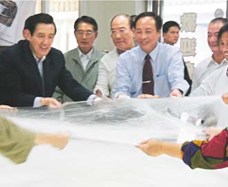 馬英九昨天到臺南縣與民眾溝通簽訂ECFA問題,座談前,抽空到農會了解蠶絲被制作過程。 來源:《聯(lián)合報》