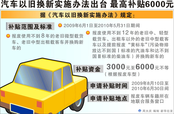 《辦法》規(guī)定,在2009年6月1日至2010年5月31日期間,報廢使用不到8年的老舊微型載貨車、老舊中型出租載客車,使用不到12年的老舊中、輕型載貨車、出租車以外的老舊中型載客車以及提前報廢“黃標車”(污染物排放達不到國Ⅰ標準的汽油車和達不到國Ⅲ標準的柴油車),并換購新車的,根據(jù)報廢車型可享受3000-6000元不等的補貼。