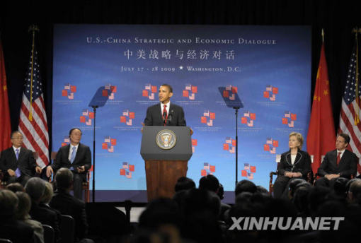 7月27日,首輪中美戰(zhàn)略與經(jīng)濟(jì)對(duì)話在美國(guó)華盛頓開(kāi)幕。中國(guó)國(guó)家主席胡錦濤特別代表、國(guó)務(wù)院副總理王岐山,國(guó)務(wù)委員戴秉國(guó)出席開(kāi)幕式。這是美國(guó)總統(tǒng)奧巴馬在致辭。新華社記者張巖攝