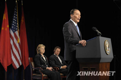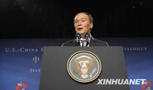 7月27日,中國(guó)國(guó)家主席胡錦濤特別代表、國(guó)務(wù)院副總理王岐山在首輪中美戰(zhàn)略與經(jīng)濟(jì)對(duì)話開(kāi)幕式上講話。當(dāng)日,首輪中美戰(zhàn)略與經(jīng)濟(jì)對(duì)話在美國(guó)華盛頓開(kāi)幕。新華社記者張巖攝