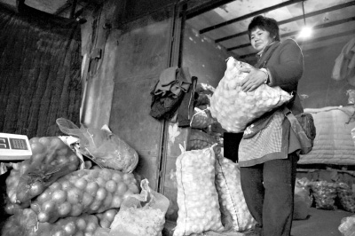 某農貿批發(fā)市場一位大蒜批發(fā)商正在搬運大蒜。新華社記者王菲攝