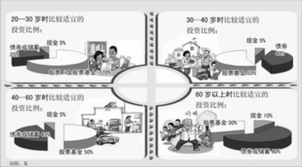 摩根士丹利華鑫基金公司副總經(jīng)理秦紅表示,一般隨著年齡增長,投資者的風(fēng)險(xiǎn)承受能力會(huì)逐步降低,因此需調(diào)整激進(jìn)型理財(cái)工具(如:股票基金)和穩(wěn)健型理財(cái)工具(如:債券基金、超短債基金、貨幣市場(chǎng)基金)的投資比例。