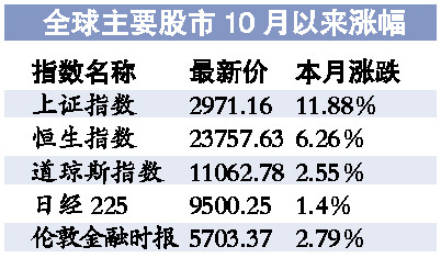最近全球主要經(jīng)濟體的經(jīng)濟數(shù)據(jù)并沒有顯著改善,但多國貨幣競相貶值,成為股市上漲最為直接的推手。道瓊斯指數(shù)一度突破11100點。香港恒生指數(shù)9月以來上漲已達15%左右。A股方面,上周上證指數(shù)以8.49%的幅度領(lǐng)漲全球。